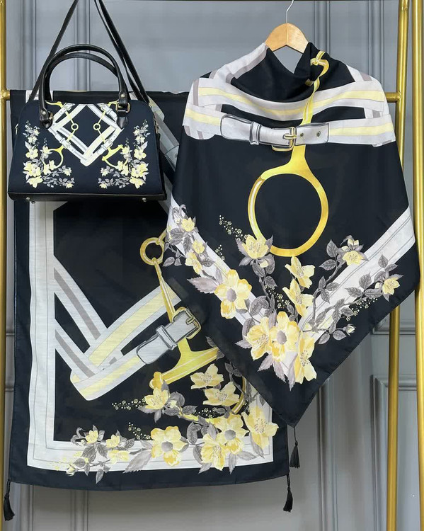 جنس کیف ترکیبی از پارچه مخمل و چرم صنعتی همراه با بند دوشی جنسی روسری و شال نخ اسپان ابعاد کیف ۳۳×۲۱ روسری قواره ۱۳۰ شال ۷۰×۱۹۰