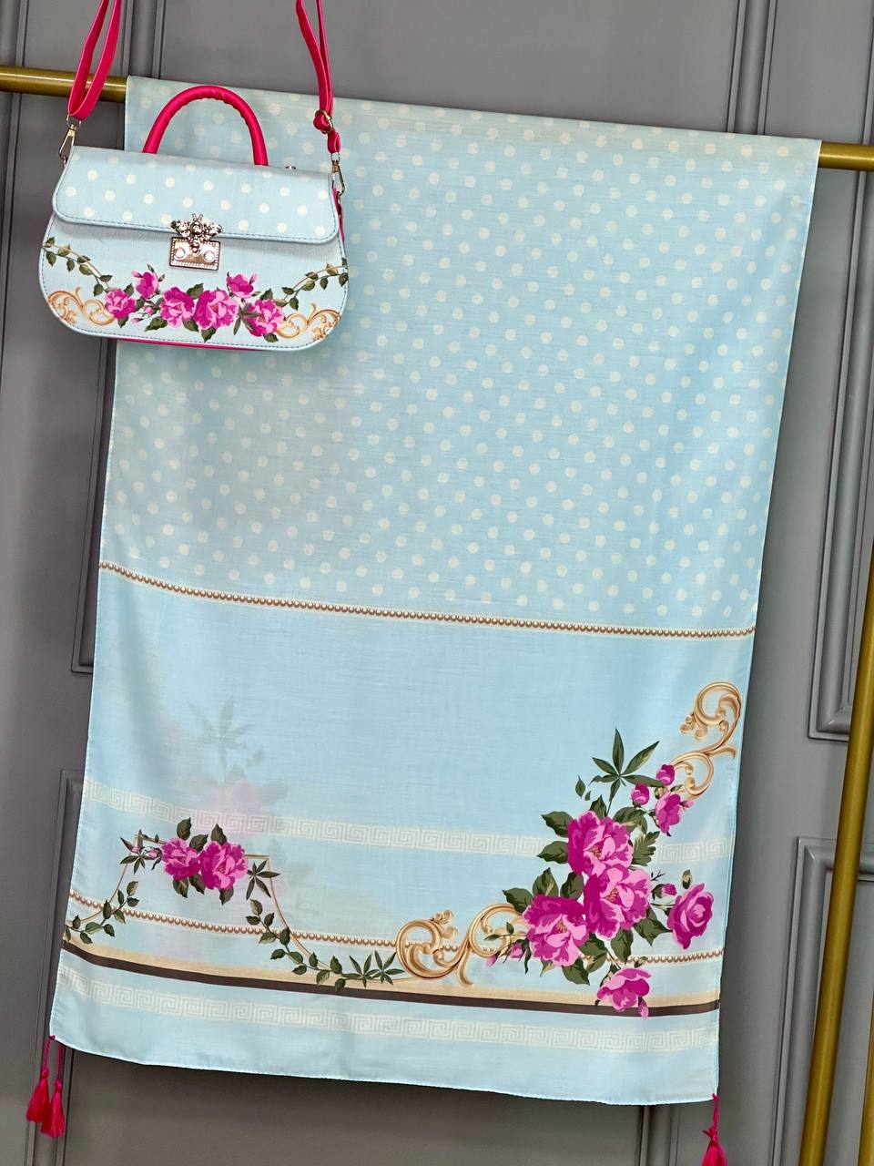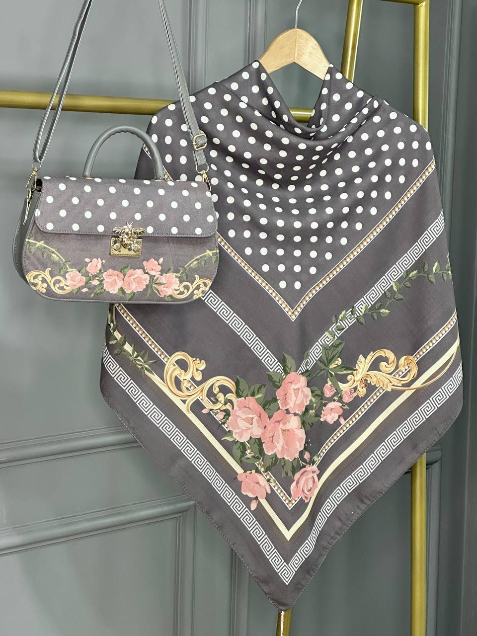 جنس کیف ترکیبی از پارچه مخمل و چرم صنعتی همراه با بند دوشی جنس روسری و شال نخ اسپان کیف در ابعاد ۱۷×۲۷ روسری قواره ۱۳۰ شال ۷۰×۱۹۰ موجود در پنج رنگ کیف ، روسری و شال تک نیز موجود است.