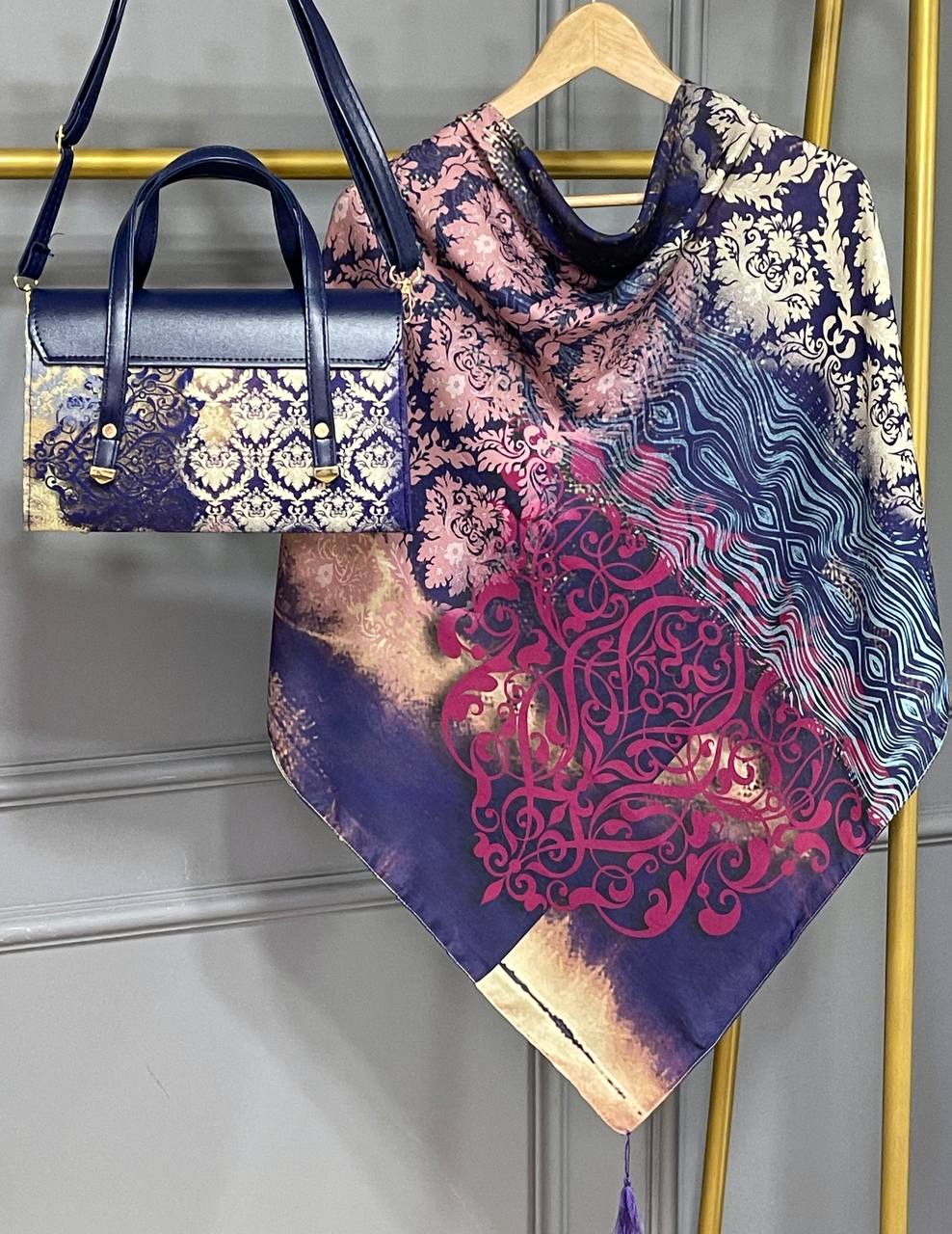 جنس کیف ترکیبی از پارچه مخمل و چرم صنعتی همراه با بند دوشی جنس روسری و شال نخ اسپان ابعاد کیف ۱۸×۲۹ روسری قواره ۱۳۰ شال۷۰×۱۹۰ کیف ، روسری و شال تک نیز موجود است.