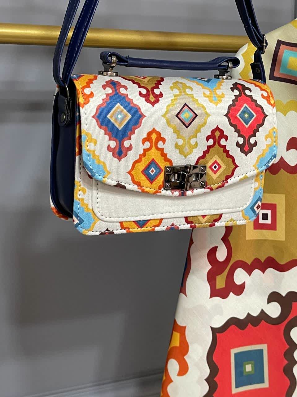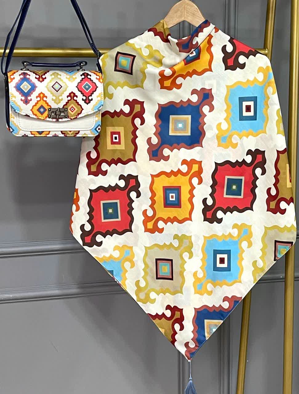 جنس کیف ترکیبی از پارچه مخمل و چرم صنعتی همراه با بند دوشی جنس روسری و شال نخ اسپان کیف ۱۷×۲۲ روسری قواره ۱۳۰ شال ۷۰×۱۹۰ کیف ، روسری وشال تک نیز موجود است