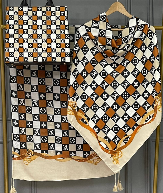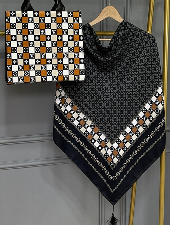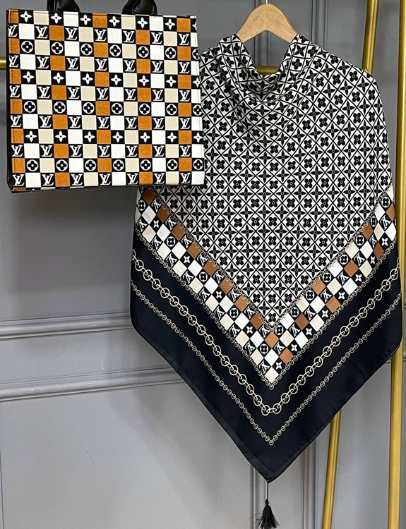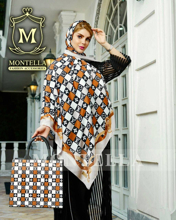 جنس کیف ترکیبی از پارچه مخمل و چرم صنعتی همراه با بند دوشی جنس روسری و شال نخ اسپان ابعاد کیف ۱۷×۲۲ روسری ۱۳۰ شال ۷۰×۱۹۰ روسری و شال تک نیز موجود است